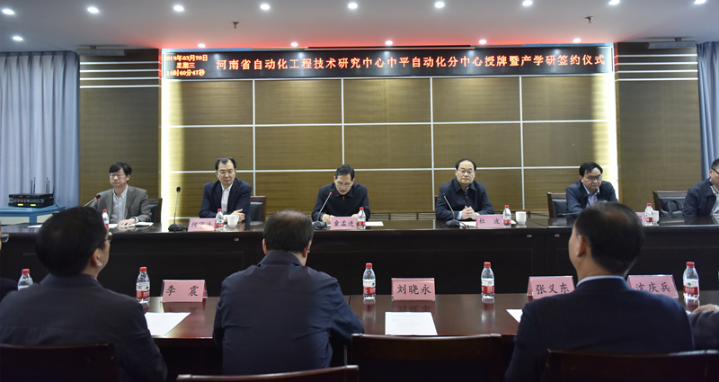 3月20日上午,河南省自动化工程技术研究中心中平自动化分中心授牌暨产学研签约仪式在省科学院7楼会议室举行,省科学院院长童孟进,省科技厅总工程师何守法,集团总经理杜波、总工程师张建国出席。